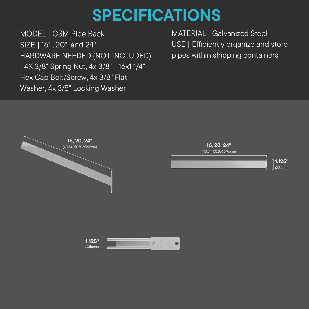 The CSM Pipe Rack is designed to secure to struts with 3/8" bolts and spring nuts.